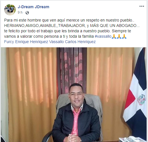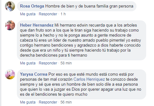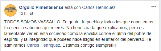 Desde ayer diferentes personalidad del Municipio de Pimentel le han brindado su apoyo a Carlos Henriquez Vasallo en lo que algunos han denominado como un mal entendido ya que a Carlos se le reconoce como una persona responsables en sus deberás; esperamos que todo este proceso llegue a buenos términos para todas las partes.