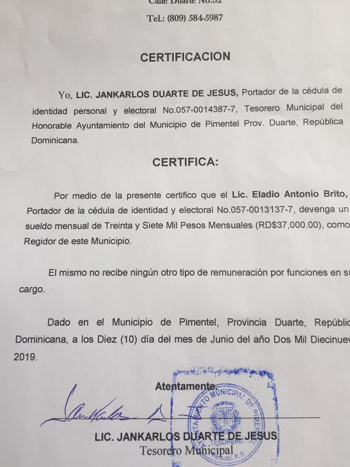 Eladio Brito: Un cordial saludo pueblo de Pimentel esta es la certificación que solicitamos al ayuntamiento municipal. Donde explica que nosotros no estamos cobrando los viáticos como regidor. Es nuestro compromiso con el pueblo ser transparente es parte nuestra gestión.
