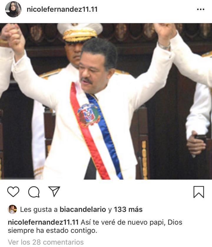 Nicole escribió en un post: “Así te veré de nuevo papi, Dios siempre ha estado contigo”, como pie en una fotografía de su padre Leonel Fernández cuando asumió la presidencia de su segundo período presidencial el 16 de agosto de 2004.